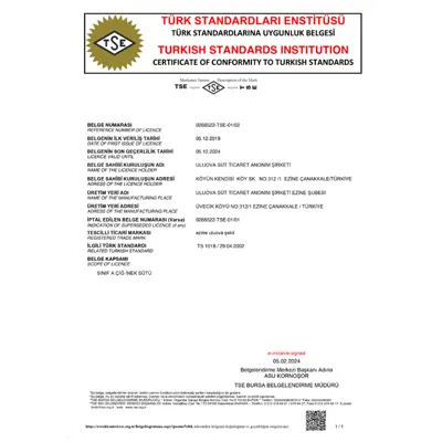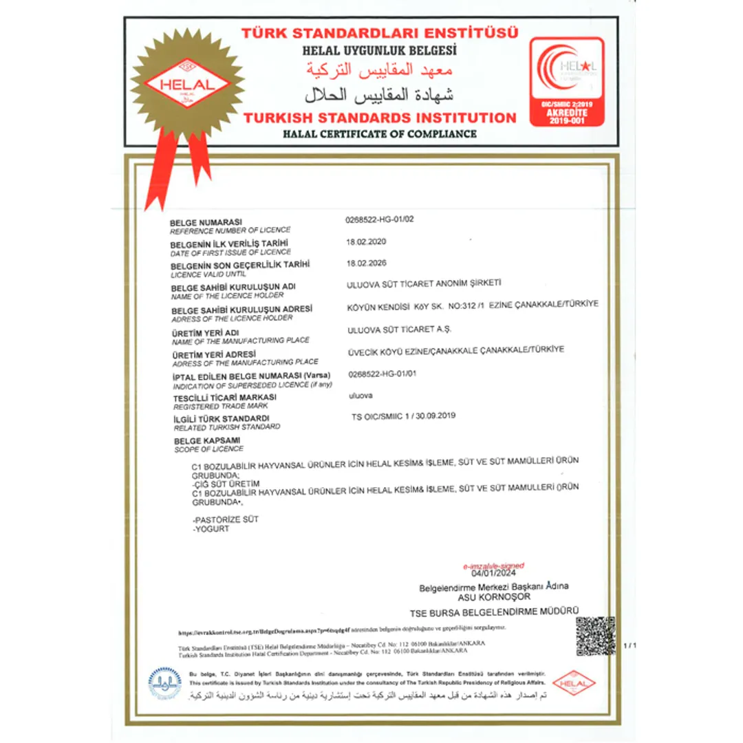 Helal Belgesi (Çiğ Süt, Pastörize Süt, Yoğurt)